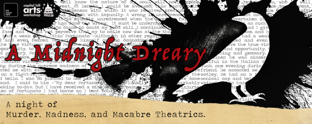 This production is a site-specific piece, originally designed for Spectre Arts and uniquely tailored for each space it's performed in. A Midnight Dreary provides an opportunity to transform a familiar space into something different; something mysterious. Each performance space is selected to both serve the story and to give the audience a chance to experience a familiar and everyday place through a lens of madness, horror, and discovery. A Midnight Dreary has been performed in bars, art galleries, homes, and yes, even theatres.