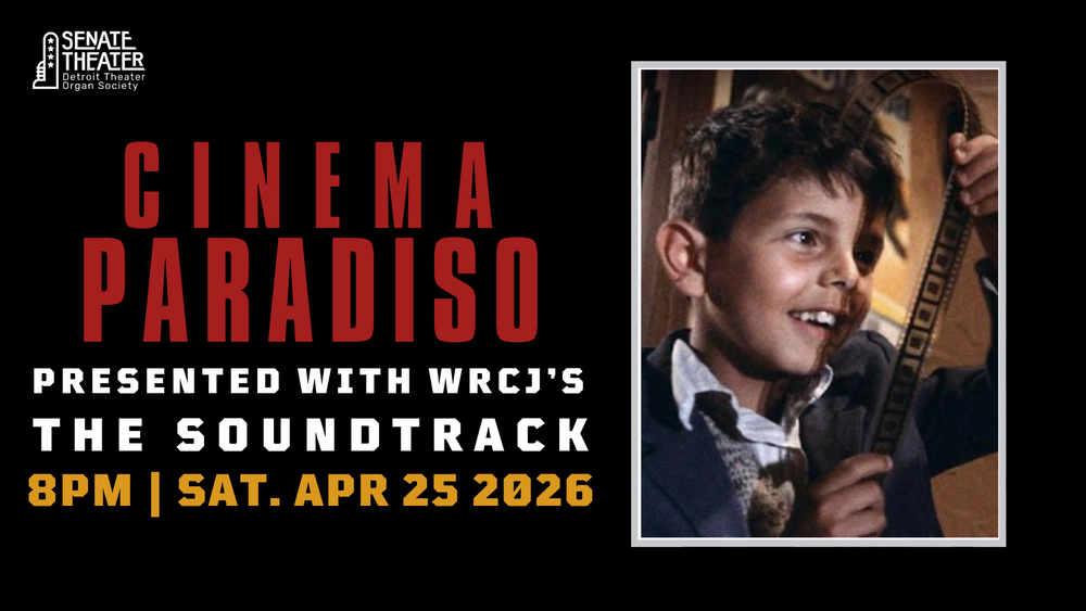 Together with WRCJ’s film score focused radio program “The Soundtrack” the Senate Theater invites you to a special screening of Cinema Paradiso! To celebrate the magic of the movies (and The Soundtrack’s one year anniversary) we’re bringing this international art house sensation and its finely tuned romantic score to the big screen. You’ll be swept away by the ecstatic synthesis of moving pictures and moving melody by Italian master Ennio Morricone and his son Andrea Morricone.