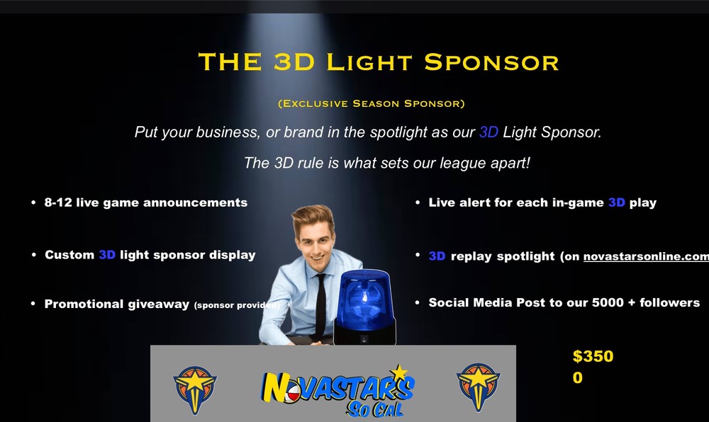 Get ready to elevate your brand to new heights with our custom 3D light display featuring your business logo at every Novastars home game. With 8-12 live in-game announcements, a promotional giveaway opportunity, and a 3D replay spotlight on our website, your brand will shine like never before. Imagine the excitement of having each in-game 3D play accompanied by a live brand alert and social media posts reaching over 100,000 viewers. Don't miss out on the chance to own the most anticipated and highest viewed moment of each game - The 3D Spotlight! Fully branded by your business.