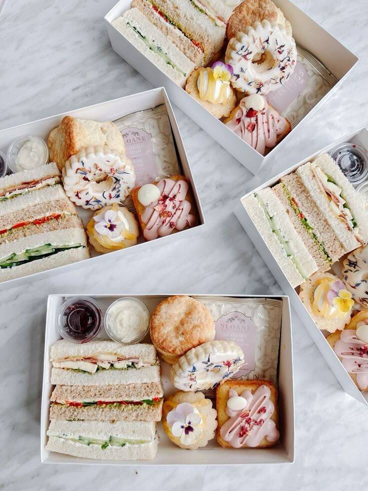 Each guest will receive a curated box that includes 3 elegant tea sandwiches, scones w/jam, 3 desserts, pasta salad and more.