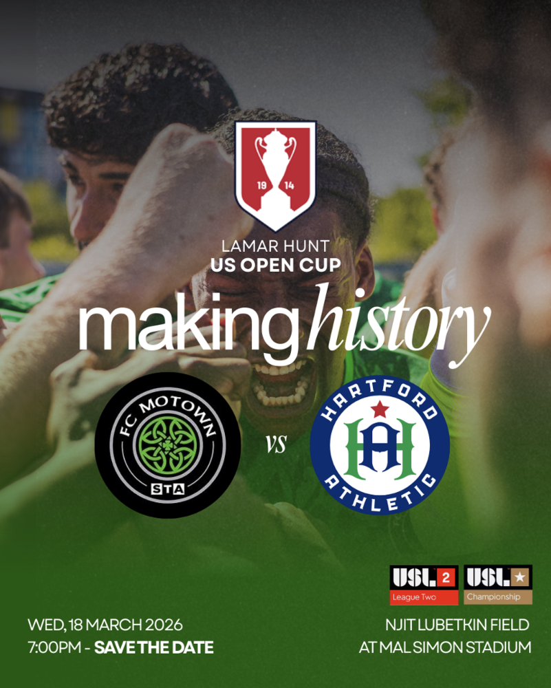 Come join us for an exciting night of soccer as FC Motown STA takes on Hartford Athletic at NJIT - Lubetkin Field at Mal Simon Stadium on 3/18/26 at 7:00 PM in the historic Lamar Hunt U.S. Open Cup.